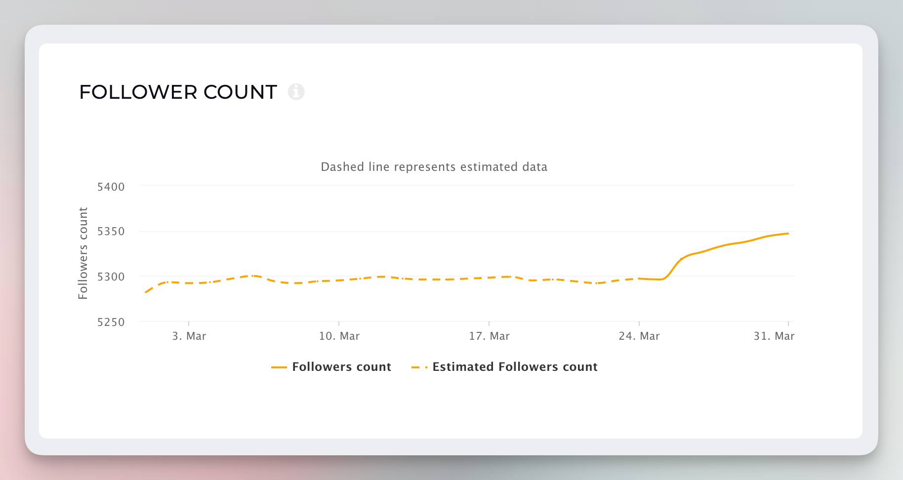 The dashed line shows the estimated data. From the day the profile is added to Socialinsider, we start gathering the count of followers. The numbers for the past dates are estimated.