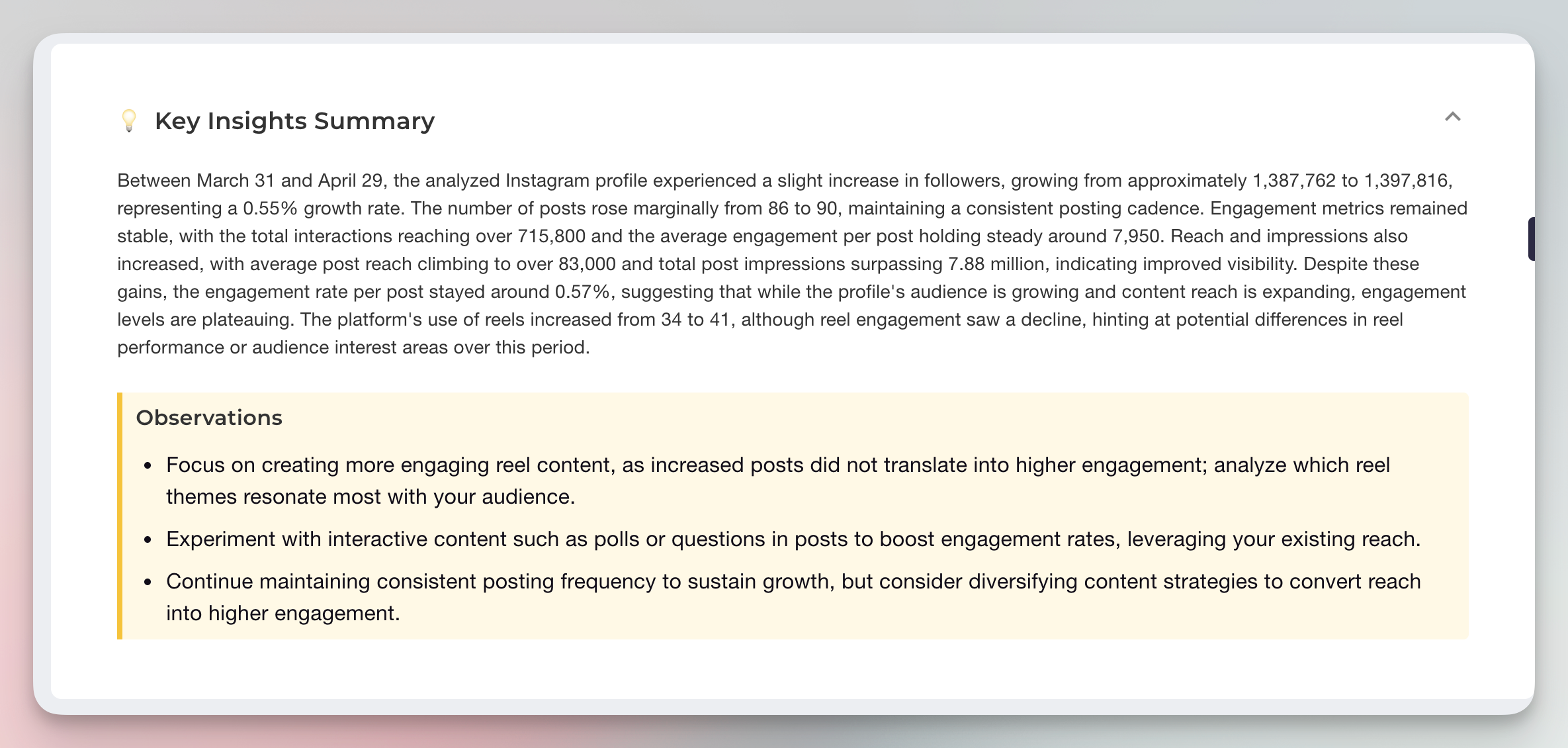 Trend Detection: Automatically highlights significant changes in engagement, reach, and audience growth
