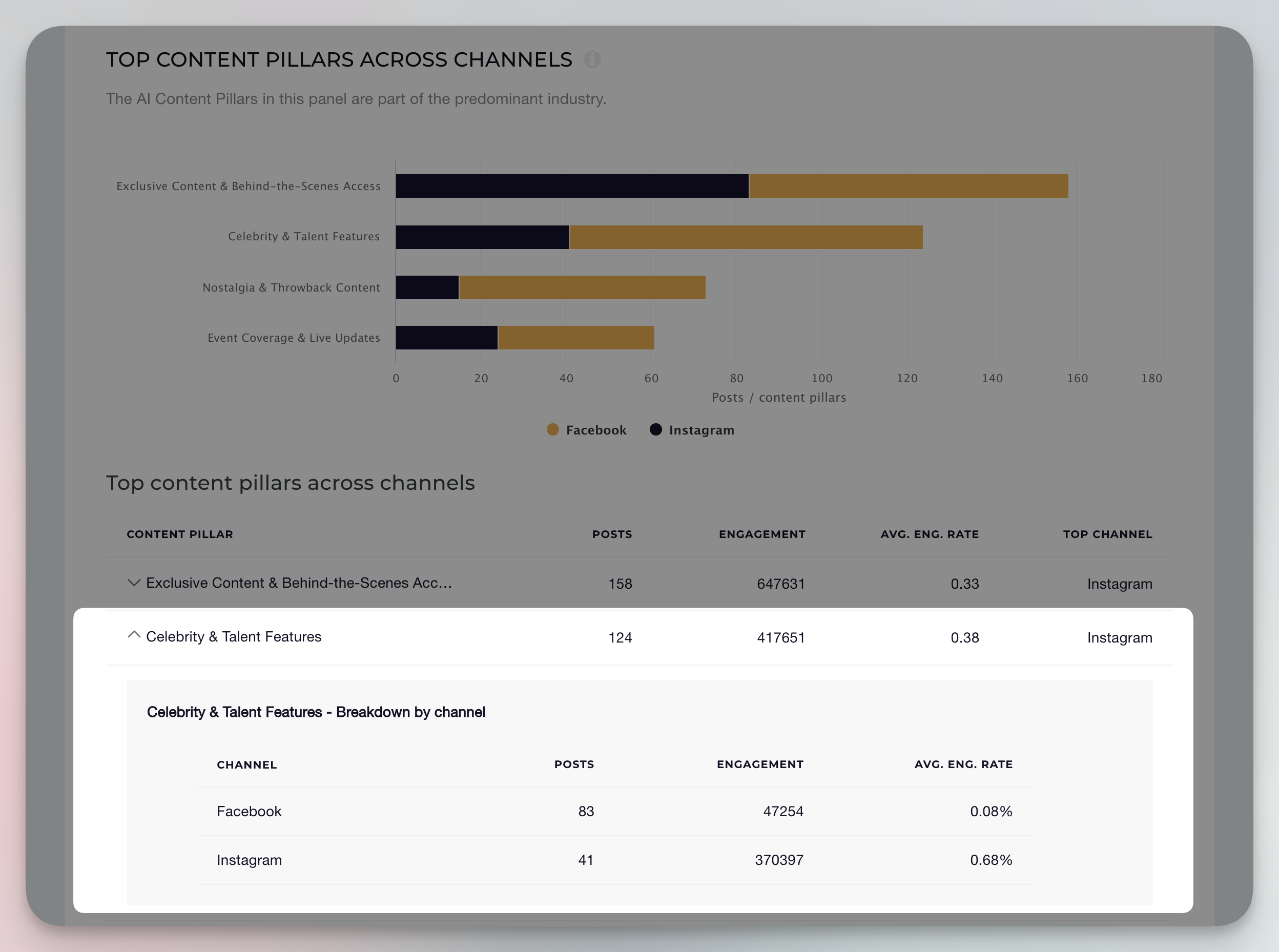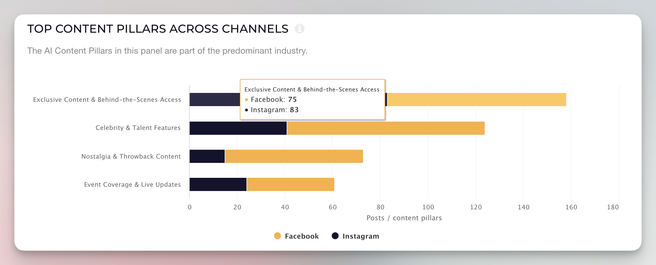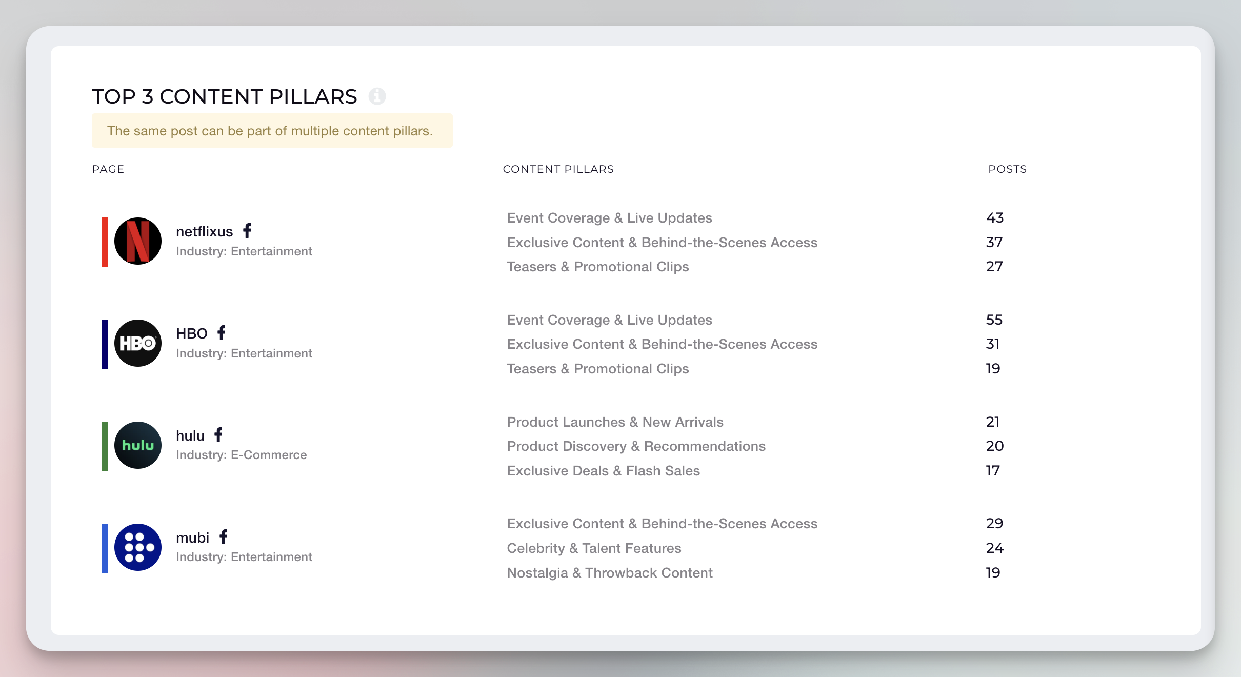 Competitive benchmarking: Easily compare the top content pillars across different profiles to identify opportunities for differentiation or alignment with industry best practices.