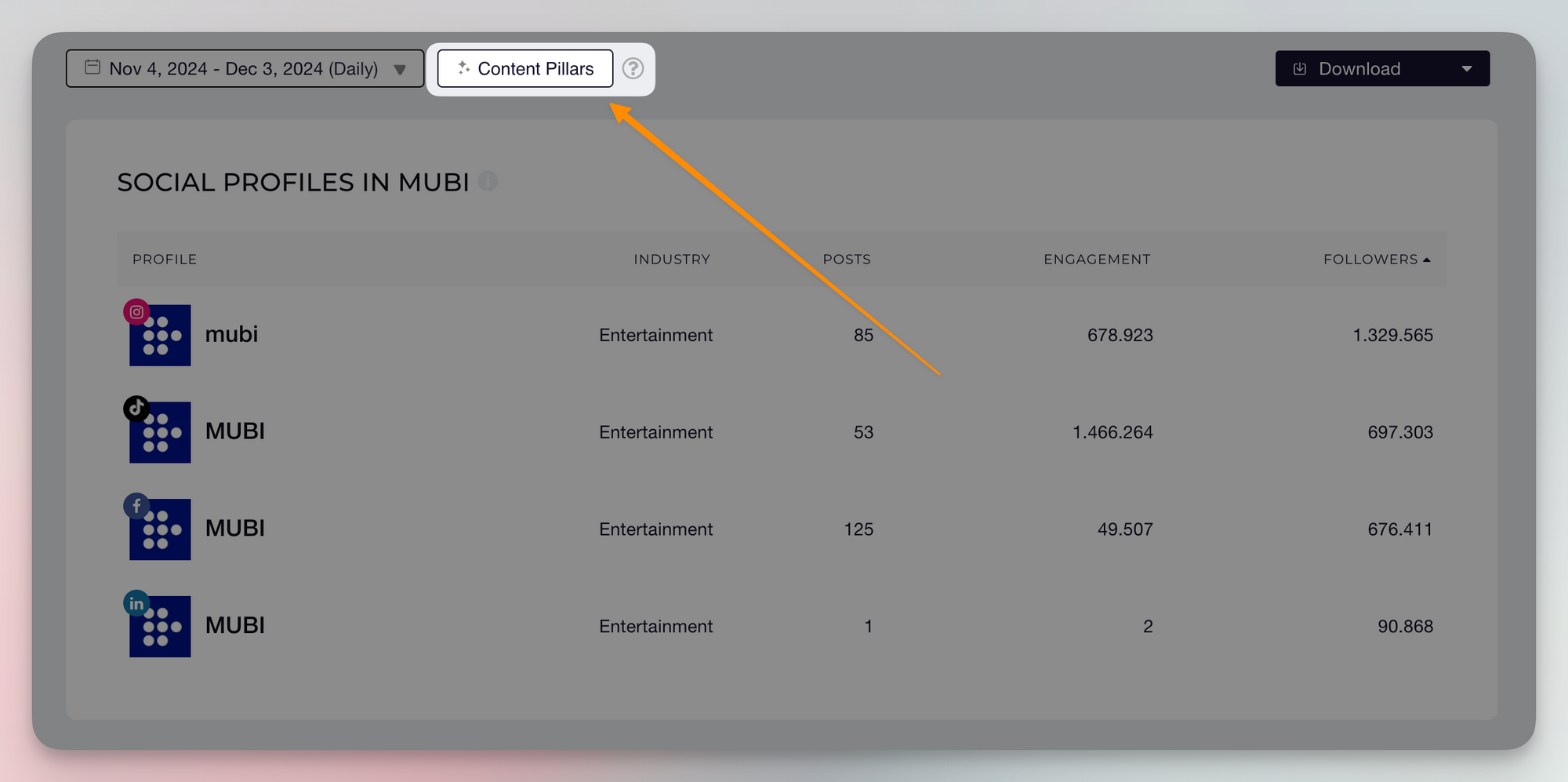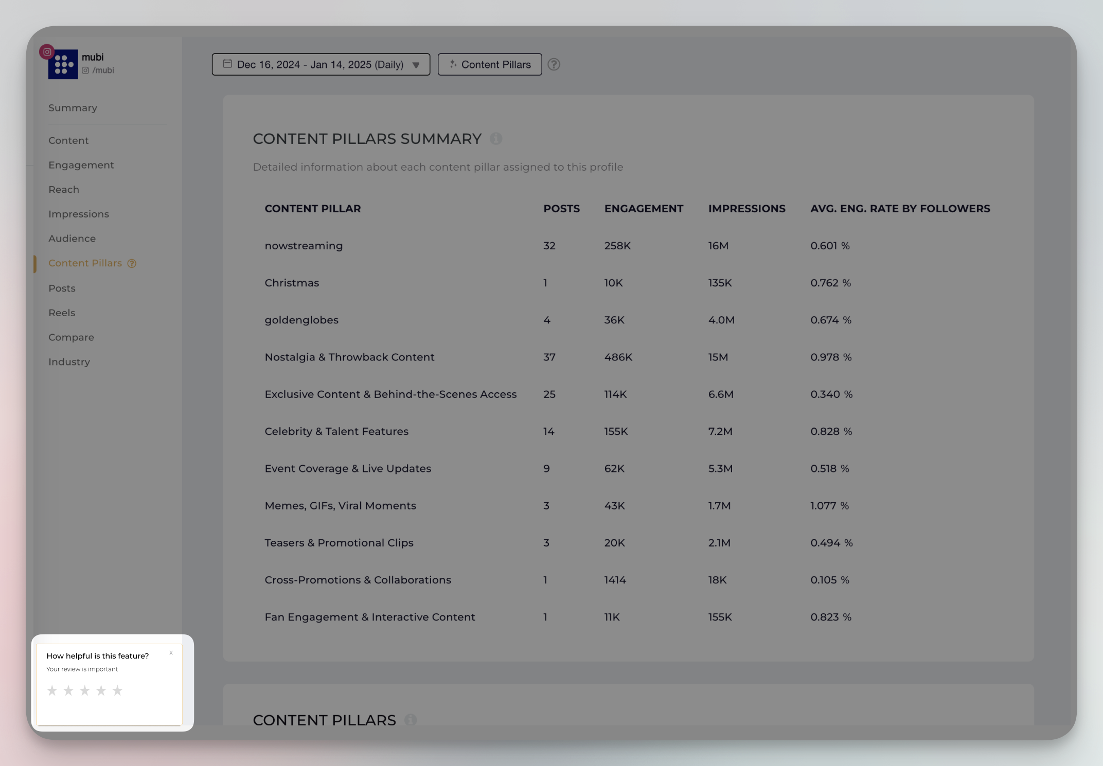 The ability to filter by Content Pillars enables more granular insights into which types of content are being prioritized in the social media strategy of this profile.