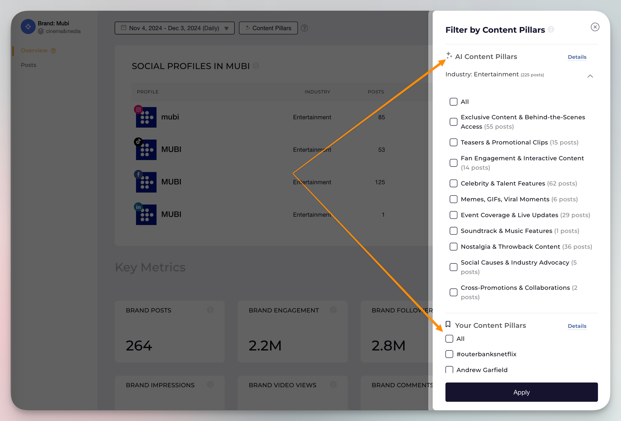Content pillar filters are now available in the Brands section, letting you filter insights by content categories.