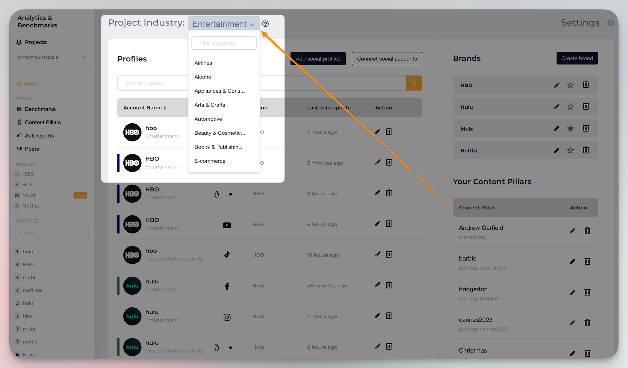For your old projects, you can set up the industry yourself. Just go to the Home section and navigate through the βProject Industryβ dropdown. From there, choose the industry that best fits your needsβ¦and your social profiles. π